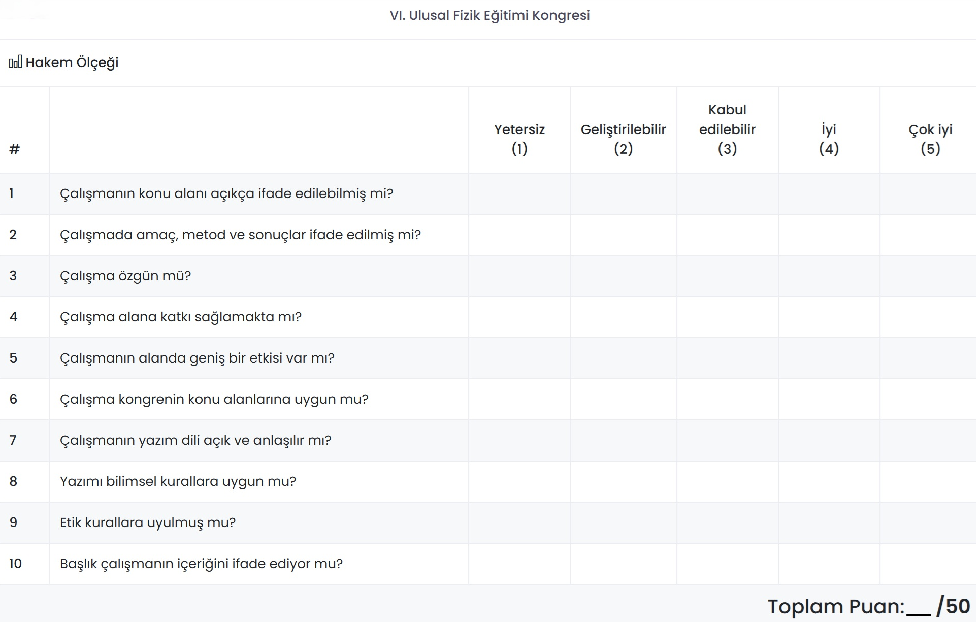Tüm gönderiler, iki ayrı hakem tarafından yapılan bağımsız bir inceleme doğrultusunda değerlendirilecektir. Özet metinler dikkate alınarak, hakemlerden her bir kriterle ilgili olarak çalışmanın kalitesini aşağıdaki puanlama düzeylerine göre puanlamaları istenecektir (maksimum 50 puan):